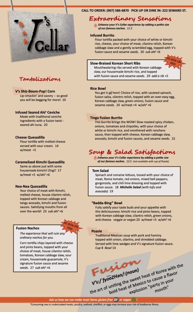 - Fusion NachosThe experience that will ruin any ordinary nachos for you. Corn tortilla chips layered with cheese and pinto beans, topped with your choice of meat, house cilantro relish, tomatoes, Korean cabbage slaw, sour cream, housemade guacamole, V’s signature fusion sauce and sesame seeds. 27 sub ahiᶧ +6