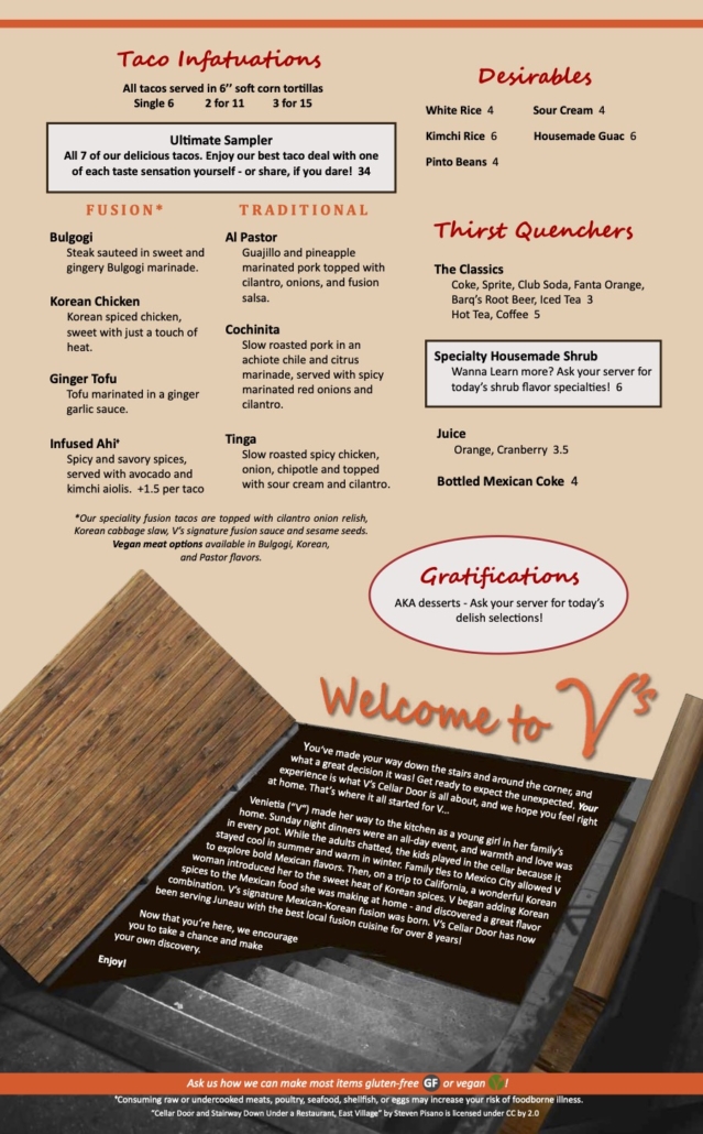 *Our specialty fusion tacos are topped with cilantro onion relish, Korean cabbage slaw, V’s signature fusion sauce, and sesame seeds. Vegan meat options available in Bulgogi, Korean, and Pastor flavors.
